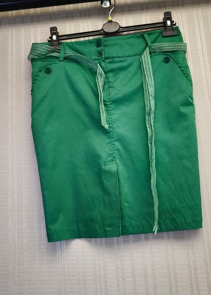 Önü yırtmaçlı etek arkasında ufak bir leke var leke çıkarıcıyla çıkacağını tahmin ediyorum