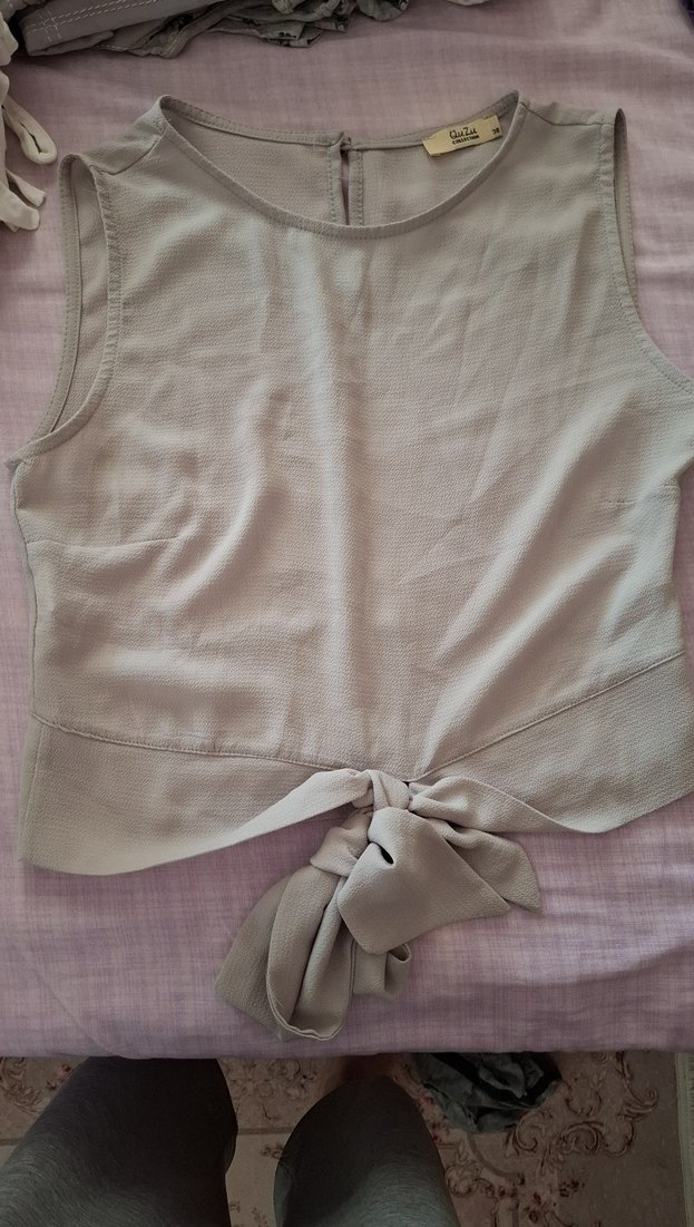 kolsuz, halter yaka ve kısa kesim, bele bağlanan fiyonk detaylı bej renkli kadın bluz. Rahat ve şık günlük kullanım için uygun.