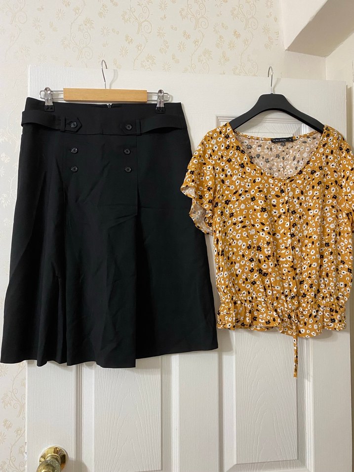 Kadınlar için pamuklu, sarı desenli, kısa kollu,kısa, bol kesim bluz. Siyah etek ile kombinlenmiştir. Günlük rahat giyim için uygundur.