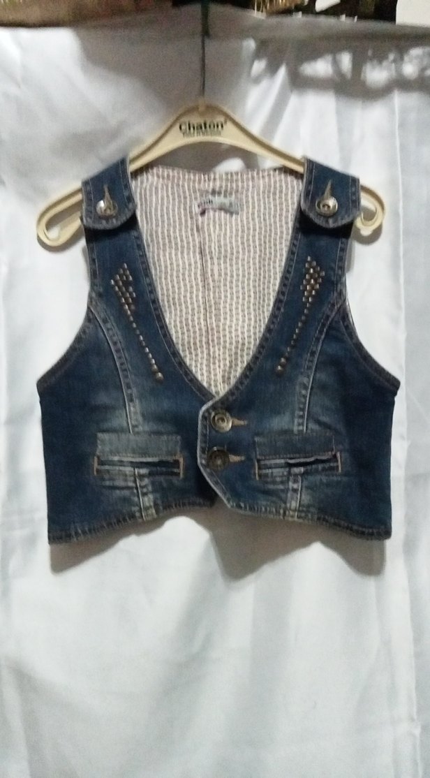 Düğmeli, kısa kesim ve dar kesimli bu kot yelek, işlemeli detaylara ve yakalı tasarıma sahiptir. Rahat sokak stili için uygundur.