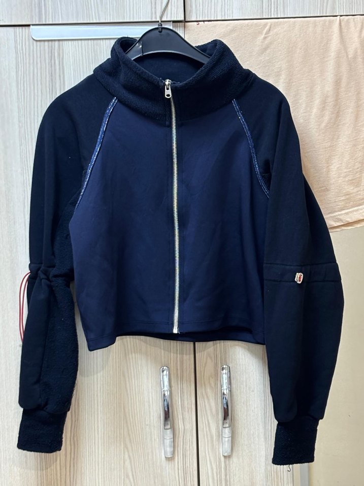Yumuşak ve sıcak kumaştan üretilmiş, fermuarlı yüksek yakalı, uzun kollu, kısa kesim ve dar kesim koyu mavi sweatshirt.
