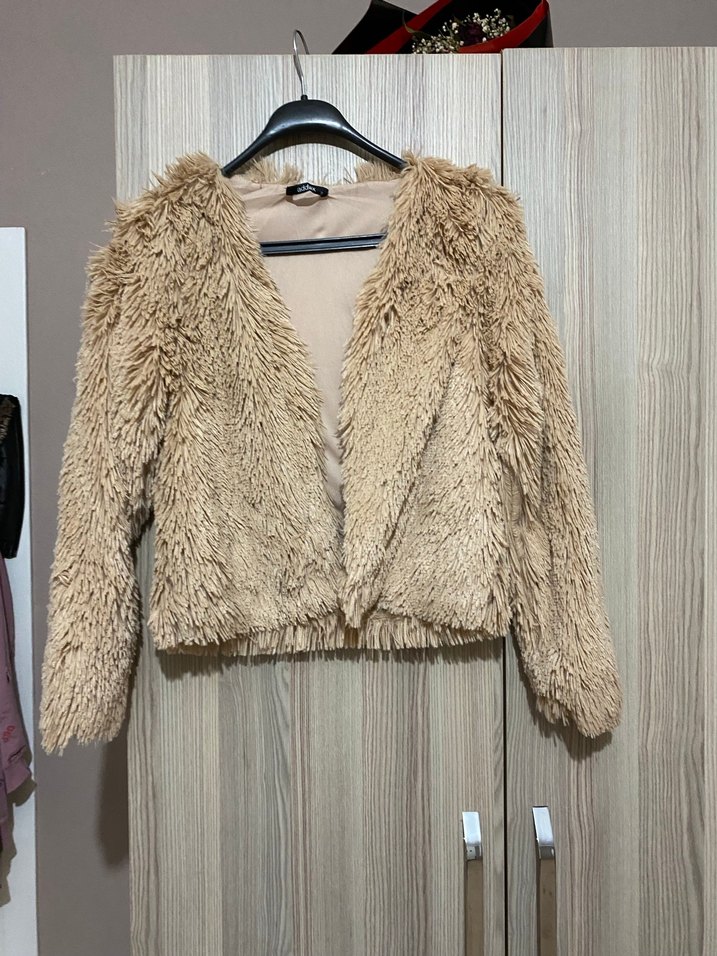 Pudra pembe renkli kısa kesim suni kürk ceket, uzun kollu ve yakası kesik detayıyla addax marka s bedeb temiz ve sayılı kullanıldı