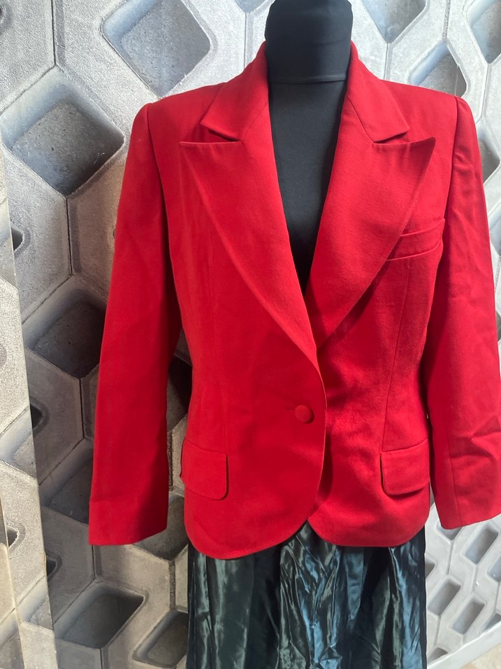 Bu kadın blazer, kırmızı ipeksi kumaşla düğmeli ve klasik yakalıdır. Uzun kollu, kısa kesim ve regular fit olarak ofis stiline uygundur. İki kol arası 55 boy 65 kol boyu 60
