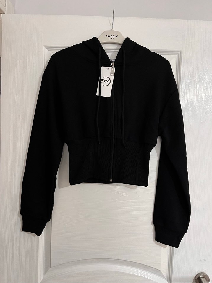 Uzun kollu, kapüşonlu ve fermuarlı siyah sweatshirt, kısa kesim ve dar kalıp. Yumuşak ve sıcak kumaştan, trend sokak stili için uygun.