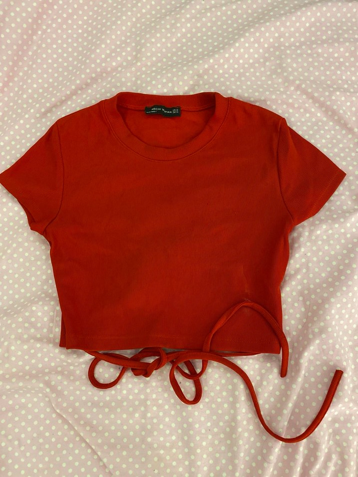 Pamuk kumaştan, kısa kollu ve yuvarlak yakalı kırmızı, vücuda oturan mini uzunlukta crop top. Bel kısmında bağlama detayları ile rahat ve şık.