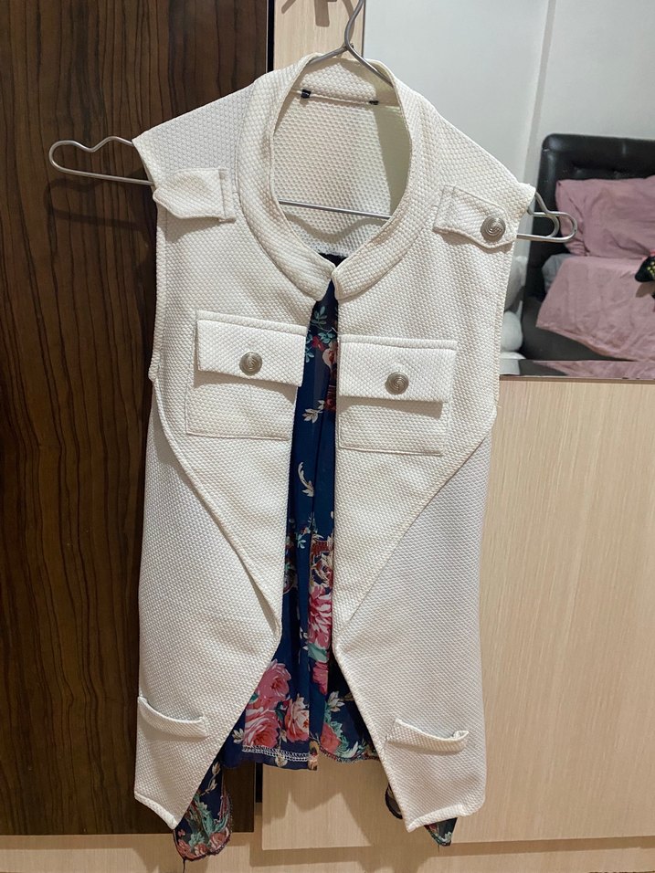 Düğmeli detaylara sahip, kısa ve fitted kesim beyaz yelek. Notch yakalı ve baskılı iç astarlı, sentetik kumaştan üretilmiştir.