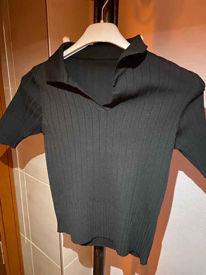 Dar kesim siyah triko kazak, kısa kol ve yakalı tasarıma sahiptir. Mini boyda, desensiz ve günlük rahat kullanıma uygundur.