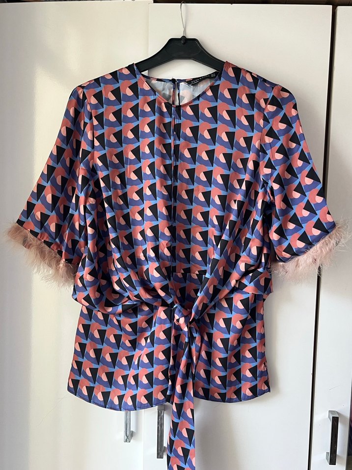 Kadın bluz, kısa kol ve mini boyda, gevşek kesimdir. V yaka ve pastel tonlarda geometrik desenlidir. Kollarında tüylü detay ve belde bağlama bulunur. Sentetik kumaştan üretilmiştir, bohem ve retro tarzlara uygundur. Ofis için idealdir. S bedene de uygun.