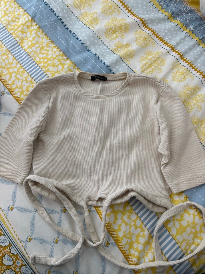 Bej renk, kısa kollu belden bağlama detaylı tşhrt crop