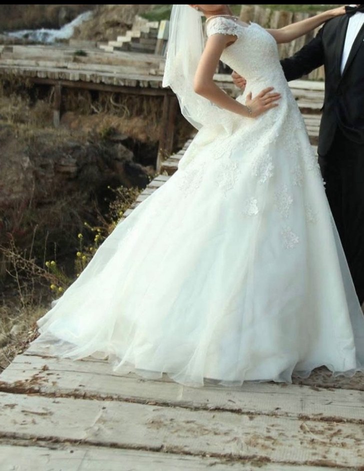 Kısa kollu, fitted üst kısmı ve uzun A kesim eteği ile klasik ve modern bir beyaz gelinlik. Fransız danteli, özel dikim. (Ersin Moda Evi/Fatih/İstanbul’da dikildi.) Modeli Straplez modeldi tasarımında biz göğüs kısmında hafif yukarı çıkacak bir model verdirdik ve hafif bir kol diktirdik, bu sayede düğün boyunca oyunda halayda çok rahat ettim ☺️ #gelinlik #fransızdantel #özeltasarım 34-36 beden arası kilom sıklıkla değişiyordu bu yüzden arkadan ayarlanabilen bir model diktirdim 38 bedene kadar olur demişti tasarımcısı. Gelinlik+duvak+ kumaş tarlatan+ tül tarlatan şeklinde 4lü takım olarak yollayacağım. Kuru temizleme yapıldı, rengi kırık beyazla ekru arası.