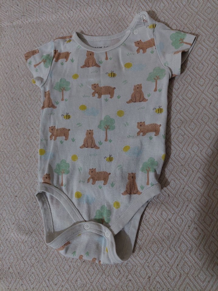 Kısa kollu, düğmeli ve yuvarlak yakalı pamuklu bebek body. Pastel tonlarda ayı, ağaç ve arı desenleri içerir.