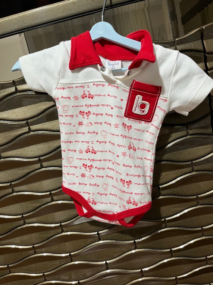 Kısa kollu, yakalı ve düğmeli kız bebek body. Renkli baskılar ve kırmızı detaylarla hareketli bir tasarım sunar.