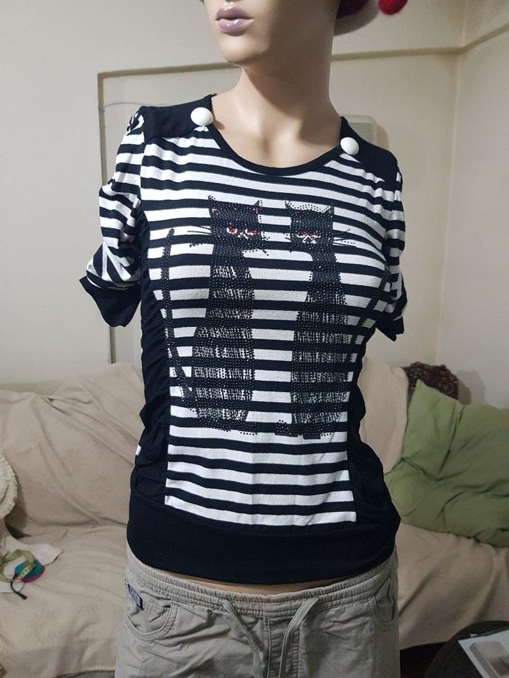 Kısa kollu,siyah beyaz çizgili, iki kedi baskılı, düğmeli detaylı,tshirt.Ölçüleri görsellerdedir.S beden kullandım,aslında 152 12-14 yaş grubuna girmektedir.