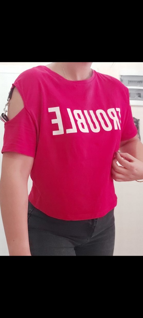 Kırmızı, kısa kollu kadın tişörtü tokalı detaylara ve baskılı ön yüze sahiptir. Rahat kesimli ve yuvarlak yakalı, yumuşak sentetik kumaştan üretilmiştir.