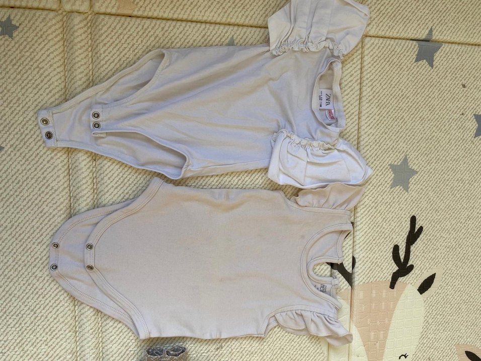 Keten kumaştan, kısa kollu, beyaz renkte ve straplez yakalı bebek body, sade ve şık tasarıma sahip.