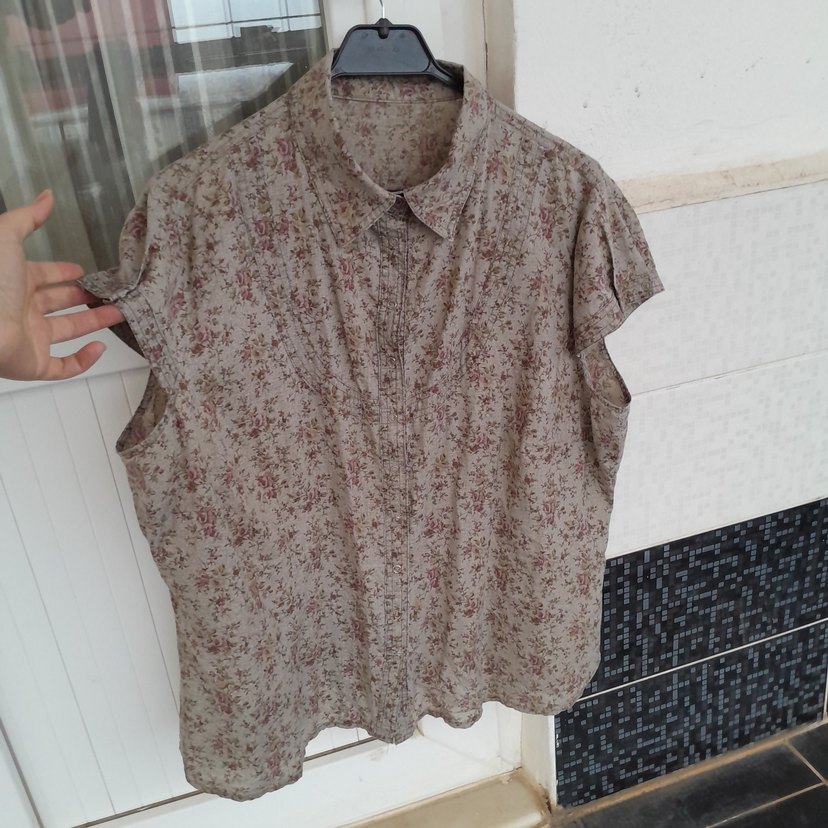 Kısa kollu, bej gömlek. Düğmeli ve yakalı, salaş kesim vintage çiçek desenli, günlük kullanıma uygun.
