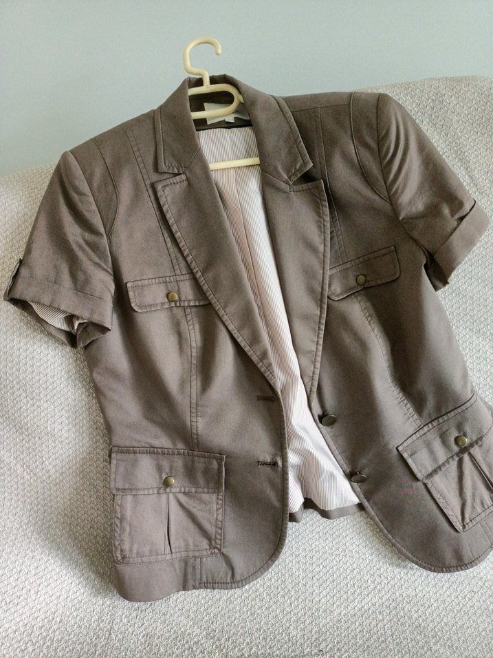 Keten kumaştan yapılmış, kısa kollu, bej renkli, düğmeli cepleri ve kesik yaka detayı olan midi uzunlukta kadın blazer ceket. Ofis için uygundur.