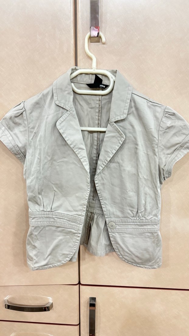 Bu bej blazer keten kumaştan, kısa kollu ve fitted kesime sahip. Düğmeli önü ve kesik yakası ile günlük veya ofis kullanımı için uygundur. S beden ama m içinde uygundur