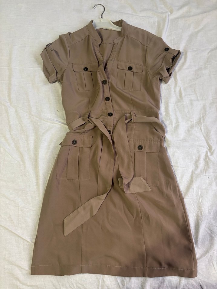 Kısa kollu, bej renk midi elbise, kemerli ve fitted kesime sahip. Ön cep detayları ve notched lapel yaka ile günlük kullanıma uygun.