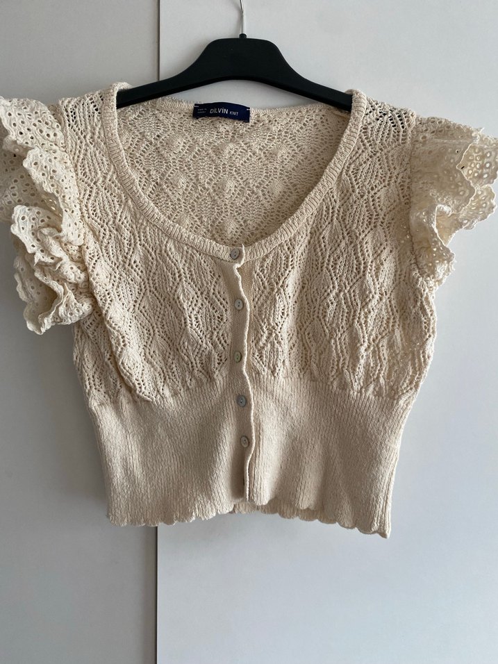 Bej renkli örgü mini hırka, kısa kollu ve fırfırlı detaylara sahiptir. Yuvarlak yaka ve bol kesimiyle bohem vintage tarzını yansıtır.