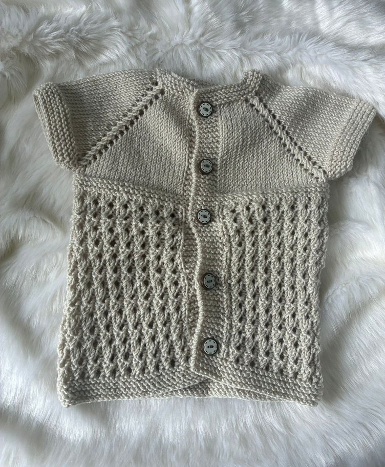 Bej renkte kısa kollu, yuvarlak yakalı ve düğmeli triko hırka. Alt kısmı dokulu örgü desenli, rahat ve bohem tarzda, günlük kullanıma uygun.