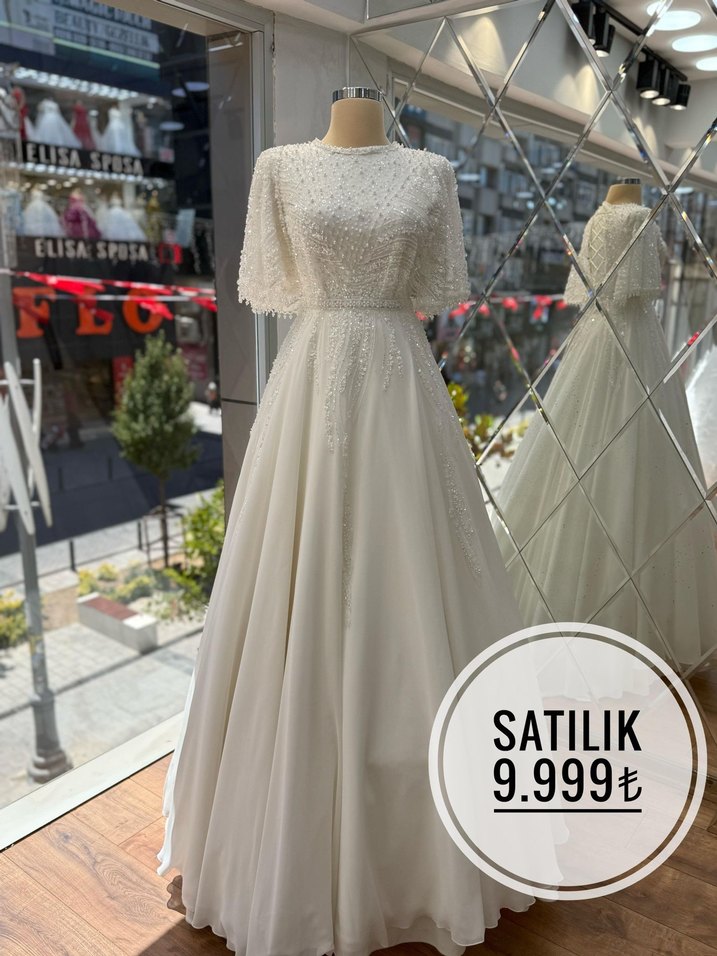 Parlak beyaz renkte, kısa kollu, tekne yaka ve A kesim uzun gelinlik. Modern klasik tarzda, düzenli kesim. Fiyat: 9.999₺.