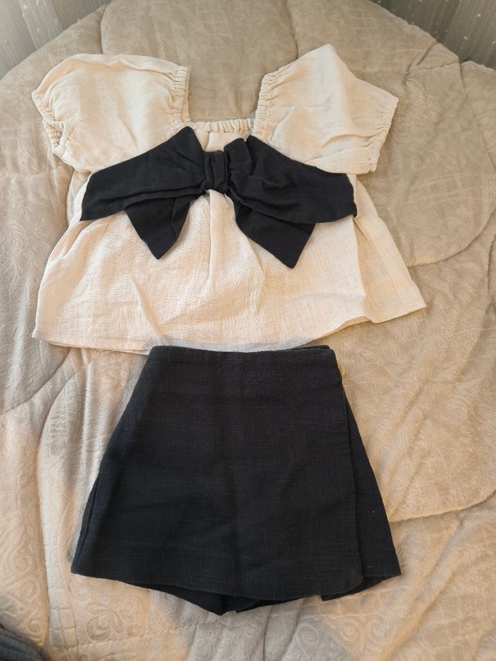 Kısa kollu beyaz üstü büyük koyu renk fiyonk detaylı, uyumlu koyu renk etekli bebek kız takımıdır. Kumaşı yumuşak ve rahattır. altı şort etektir etiketi kızımı rahatsız ettiği için kesmiştim üst etiketi mevcut