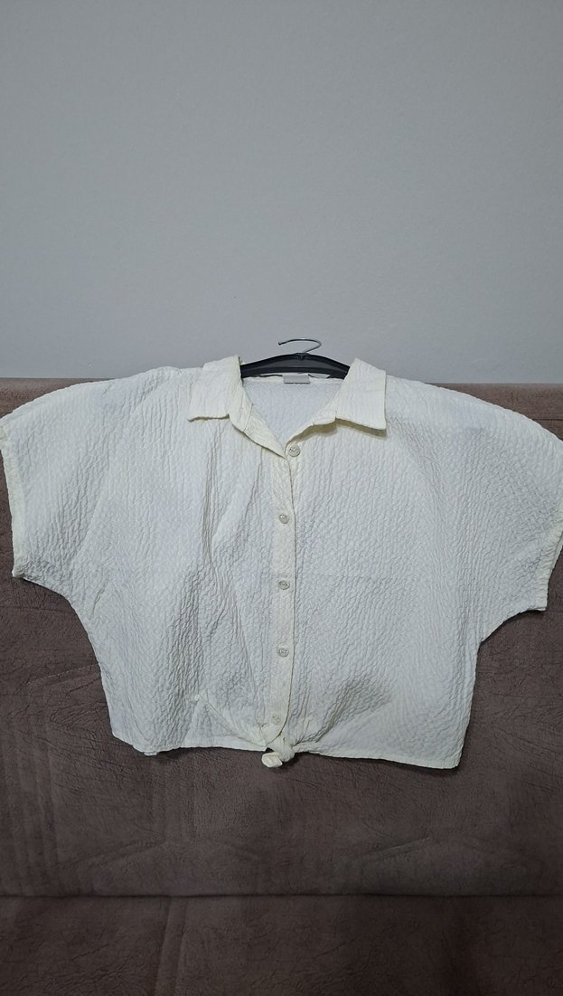 Kısa kollu, yakalı, düğmeli beyaz keten gömlek. Salaş kesimi ve kısa boyuyla sade sokak stiline uygundur.