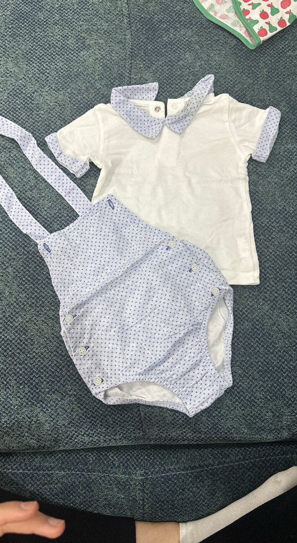 Pamuk kumaştan yapılmış, kısa kollu beyaz yakalı gömlek ve düğmeli gri desenli askılı şortlu bebek takımı.