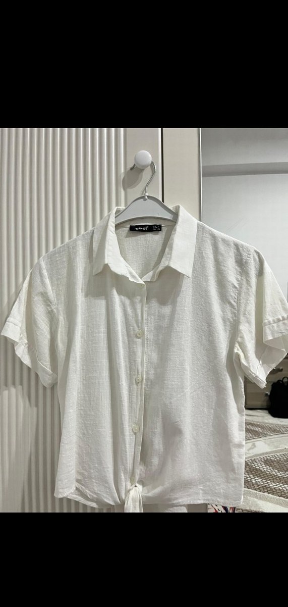Kısa kollu, yakalı ve düğmeli beyaz keten gömlek. Salaş kesimi ve kısa boyu ile minimalist sokak stili için uygundur.