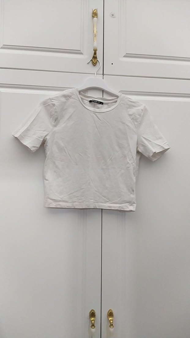 Beyaz penye tişört, kısa kollu ve kısa kesim, yuvarlak yaka ile sade ve şehir stilini yansıtır, günlük kullanıma uygundur. croptur.