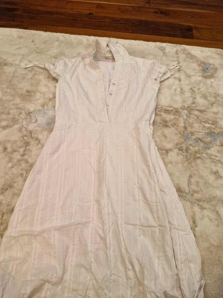 Keten kumaştan, kısa kollu ve yakalı kesime sahip, fitted uzun elbise. İnce kürk detayları ve vintage bohem tarzını yansıtıyor. Günlük kullanım için uygun.