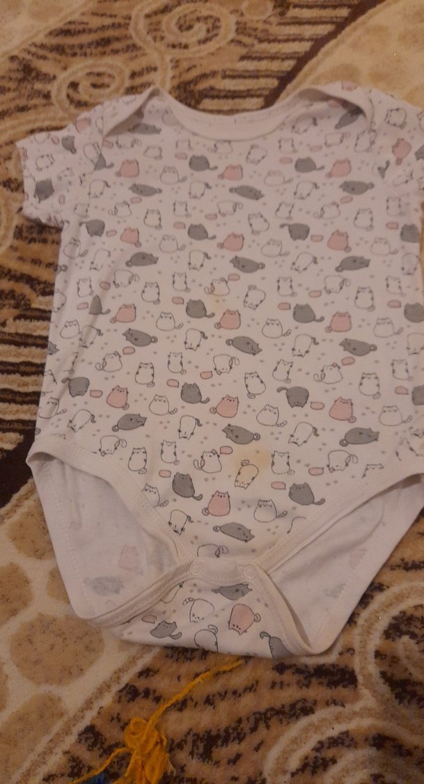 Kısa kollu, yuvarlak yakalı beyaz kız bebek body, pastel hayvan desenleri ve ince dantel detaylıdır. resimde gösterdiğim gibi ufak bi leke var başka sıkıntı yok
