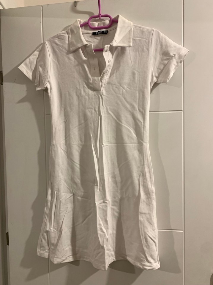 Kısa kollu, yakalı beyaz midi elbise, yumuşak keten kumaştan üretilmiştir. Sade ve fit kesimdir, günlük rahat giyim için uygundur.