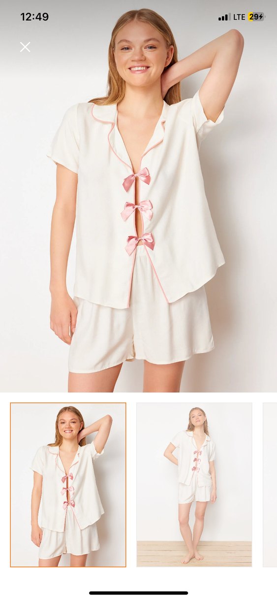 Gevşek kesim, kısa kollu beyaz mini pijama takımı, pastel pembe fiyonk detayları ile. Minimalist ve çağdaş tarzda, hafif batik desenli.