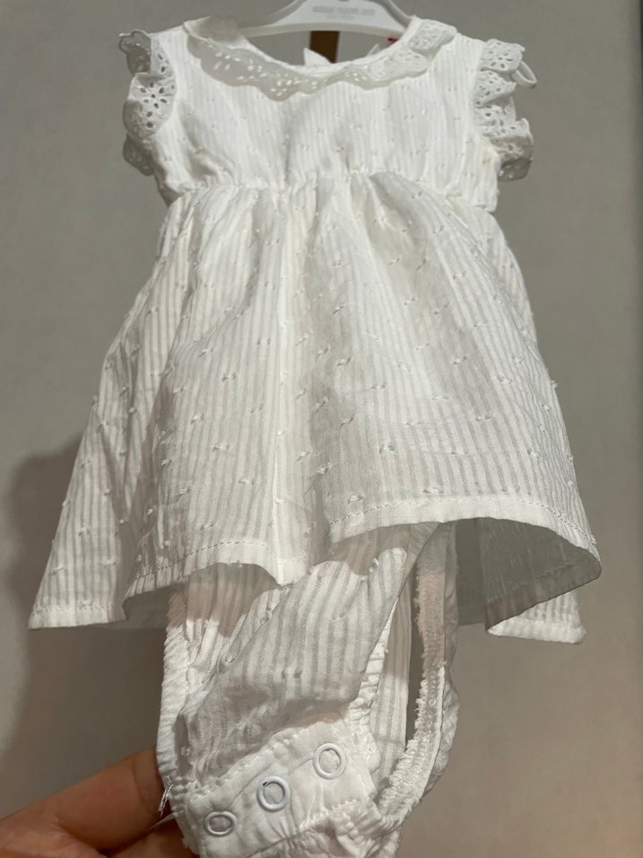 Kısa kollu, fırfırlı ve nakış detaylı beyaz kız elbisesi. Hafif ve rahat kumaştan üretilmiştir.