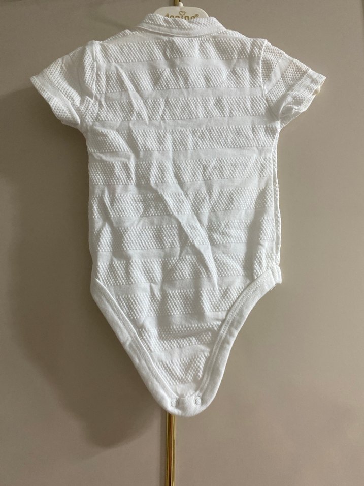 Kısa kollu, yakalı beyaz örgü bebek body. İnce dokulu deseni ile rahat ve nefes alabilir yapıda.