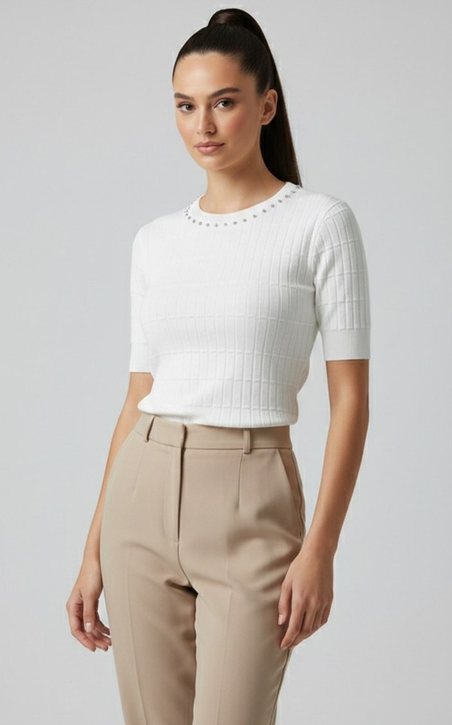 Kısa kollu, yuvarlak yakalı beyaz örgü kazak, mini uzunlukta ve küçük boncuk detaylıdır. Trendy casual sokak tarzına uygundur. Günlük kullanıma idealdir.