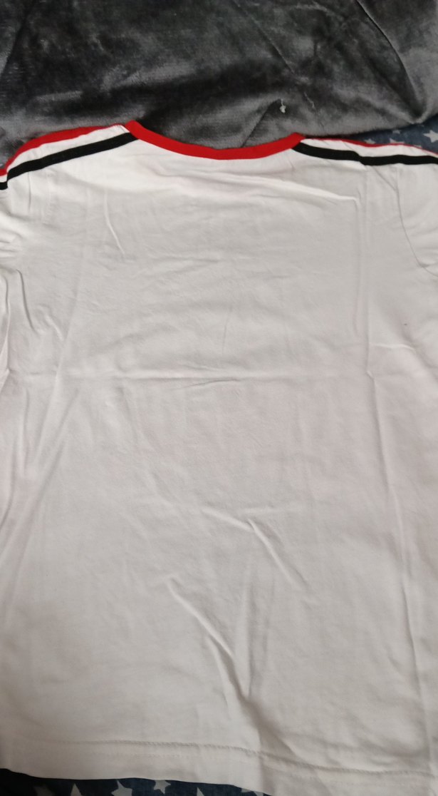 Kısa kollu, kırmızı yakalı beyaz pamuklu tişört, omuzlarda siyah çizgiler ve göğüste küçük baskılı logo bulunur. Rahat ve şık sokak tarzı için uygundur.