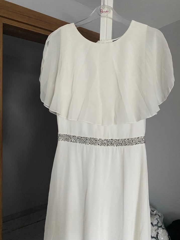 Kısa kollu, yuvarlak yakalı ve bol kesimli beyaz uzun gelinlik. Minimalist tasarıma sahip, belinde ince bir kemer detayı bulunur.