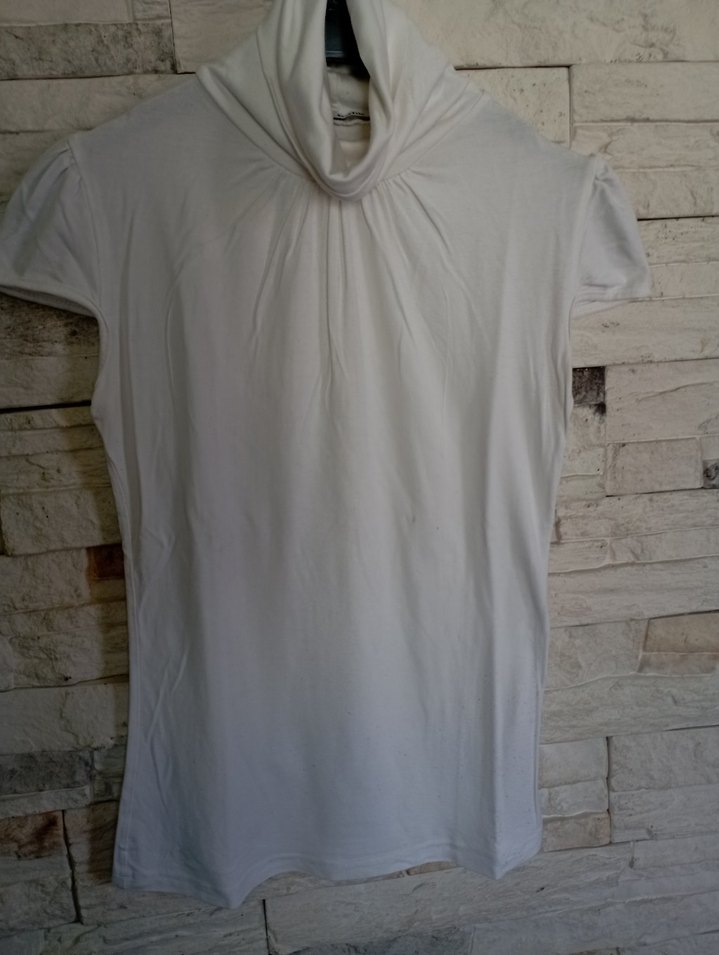 Yumuşak keten kumaştan, kısa kollu ve yüksek yakalı, beyaz renkte, hamileler için uygun, sade ve şık bir bluz.