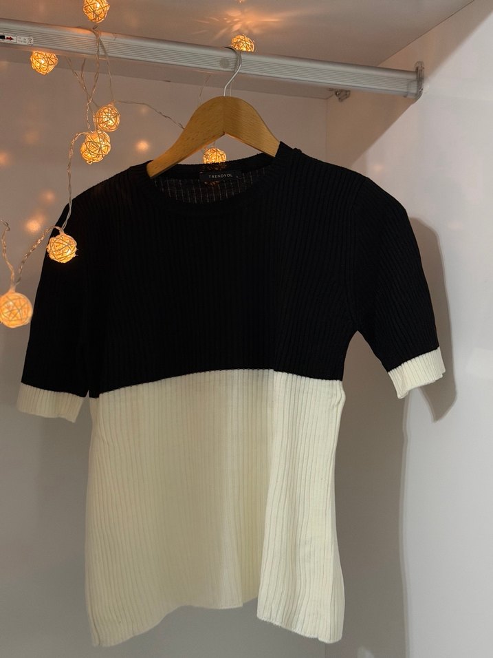 Kısa kollu, bisiklet yaka, örgü kadın kazak. Siyah ve beyaz iki renkli, normal boyda, sade ve şık tasarım. Günlük rahat sokak stili için uygun.
