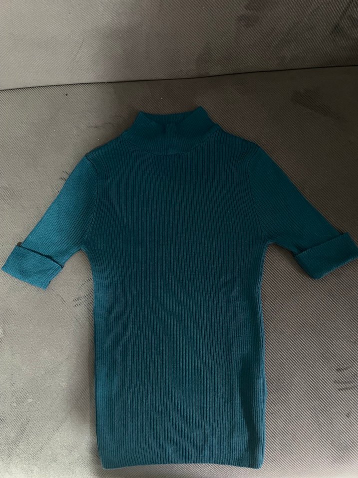 Kısa kollu ve boğazlı, turkuaz renkli triko kazak. düz desensiz, günlük rahat sokak stili için uygun.