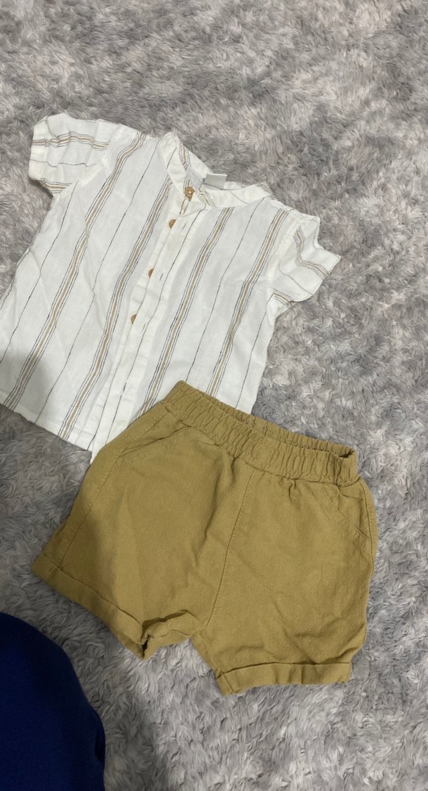 Kısa kollu, düğmeli bohem tarzda bebek erkek takımı. Üstü hafif çizgili, altı bej şort ile tamamlanmıştır.