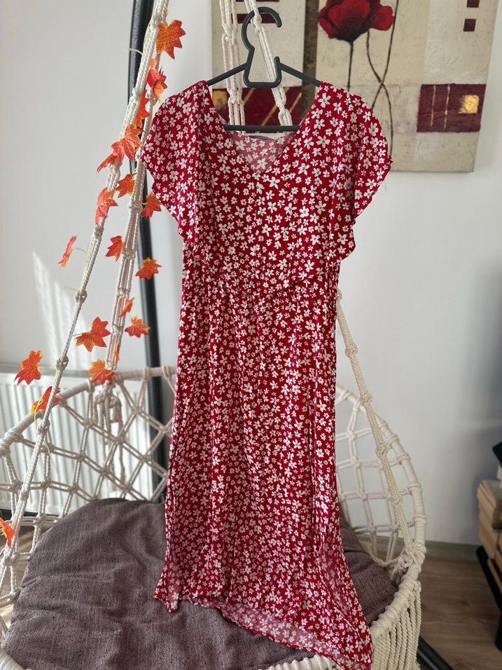 Kısa kollu, V yaka uzun ve bol kesim elbise. Canlı kırmızı çiçek desenli, yumuşak sentetik kumaştan, günlük kullanım için uygundur.