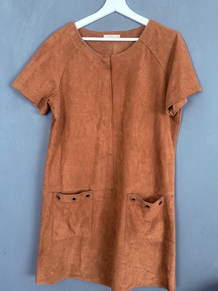 Kahverengi süet kumaştan, kısa kollu, yuvarlak yakalı ve düğmeli ön detaylı, cep detaylı rahat kesim midi boy kadın elbisesi. Bohem tarzda günlük kullanıma uygun.