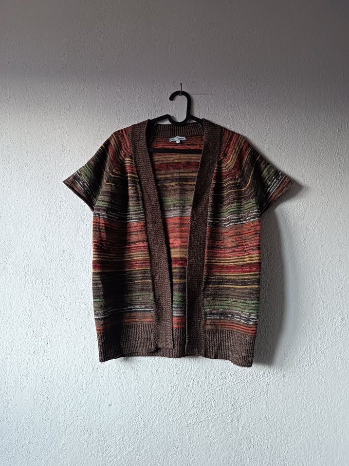 LCW koyu kahverengi tonlarda renkli cizgili desenli, ay kollu ve bol kesim örgü hırka. Günlük kullanım için uygundur. Bohem tarzı yansıtır. İki koltuk arası genişliği 50 cm, boyu 63 cm dir. L beden. Bu sayfadaki ürünler, ek gelir amaçlı satışta değildir. İkinciel butik satış fiyatlarıdır ve bu sebeple fiyat sondur. Sadece toplu alımlarda indirimden faydalanabilirsiniz. (üç ürün yüzde 5, beş ürün yüzde 15) Aynı gün kargoya verilir. Instagram: @namaste.vintage