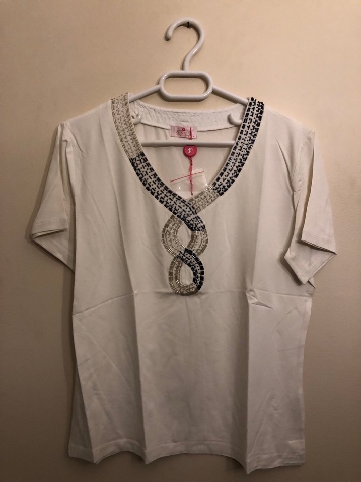 Kısa kollu, V yakalı, nakış detaylı beyaz bol kesim bluz. Rahat ve günlük kullanıma uygun.