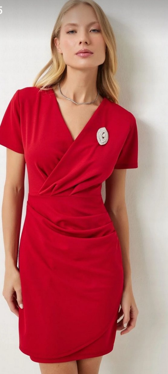 V yaka, kısa kollu, broşlu kırmızı midi kalem elbise. Parlak yüzeyli, klasik ve desen içermeyen yapısıyla ofis için uygundur. ✨