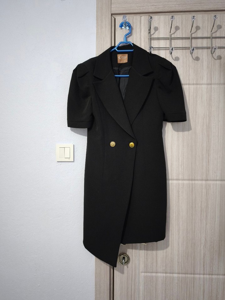 Asimetrik kesim ceket elbise. İçinde astarı bulunmaktadır. Sadece iki kez giydim. Çok çok severek kullandım, çok şık duruyor. Deniz butikten almıştım. Boyum 1.60 kilom:46